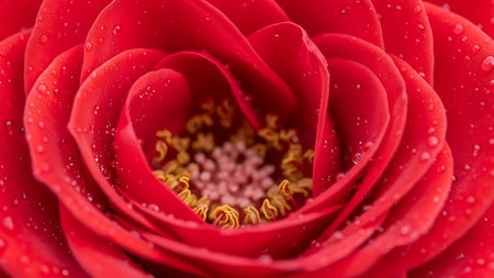 Vibrant red rose; fresh water droplets; visible pollen grains; macro detailed bloom