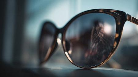 A pair of sunglasses with dark lenses and tortoiseshell frames on a flat surface