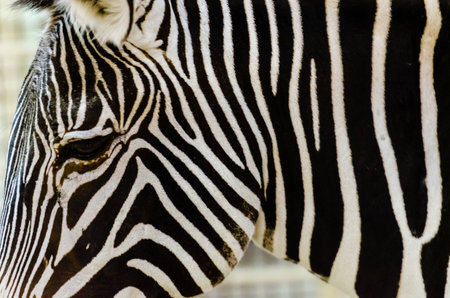 Zebras Stripes Closeup Zoo Animal: Detailed portrait of a zebra at a zoo, showcasing its distinctive stripes. Daytime observation for educational purposes.