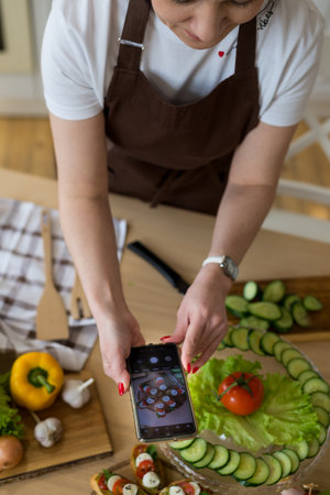 An adult woman takes pictures of stewed vegetables on the phone for social networks or a culinary blog, top view, home cooking hobby, healthy lifestyle