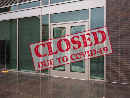 Red sign with words Closed Due To Covid-19 hanging on glass door