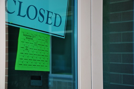 Text on white sign board “Closed†infront of the mirror’s shop . This shop was dark and closed beacuse of the bankrupcy.