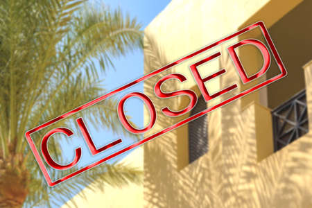 Blurred hotel background with CLOSED stamp sign. A ruined vacation. Bad holiday season. Hotel business bankruptcy.