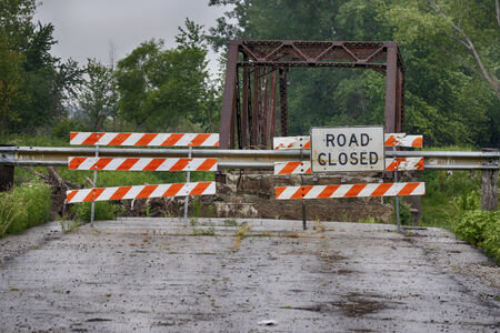 Worn Road Closed barricade blocks road at Atlanta collapsed interstate bridge construction site.