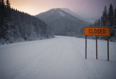 A foggy winter landscape featuring a closed road sign amidst a snowy pathway. The scene evokes a sense of isolation and tranquility, perfect for conveying cold weather themes.