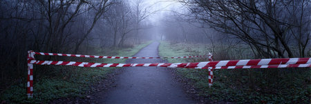 Restricted area marked by tape in a foggy forested path, indicating caution for botulinum therapy preparations, surrounded by dense trees in early morning.