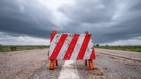 A weathered construction barrier with red and white stripes stands prominently on an empty road, signaling closure amid a gray, overcast landscape.