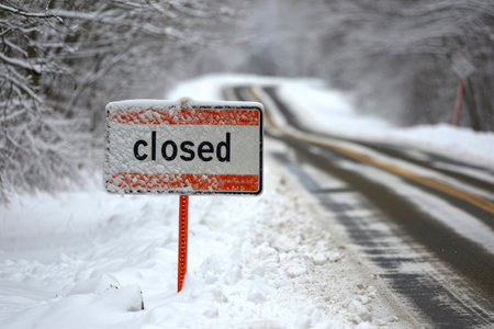Road Closed sign placed beside a snow covered road on a cold winter day