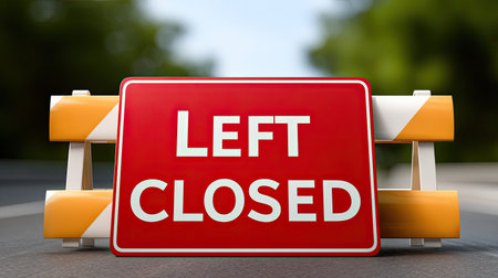 A bright red sign prominently displays LEFT CLOSED, indicating lane restrictions for drivers. The sign is set against a blurred background of trees, enhancing the warning message.