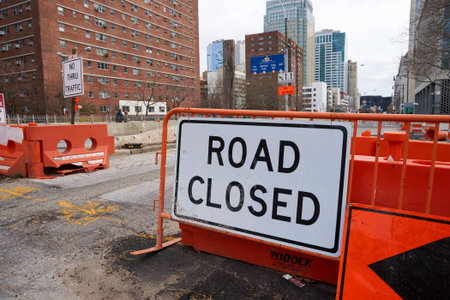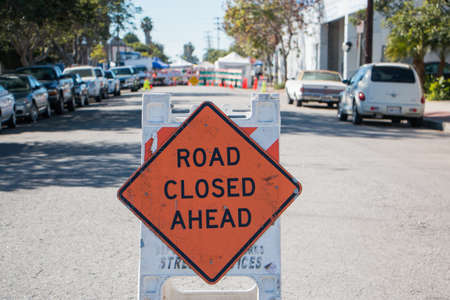 Road Ahead Closed sign in front of city construction zone with restricted access