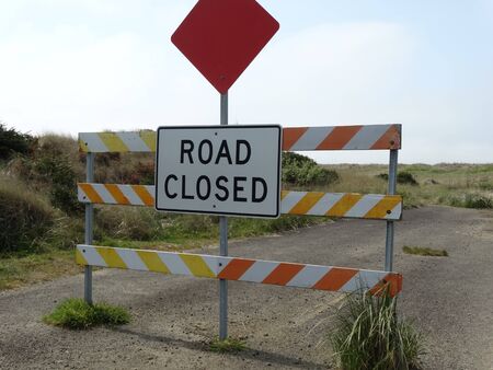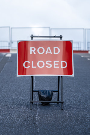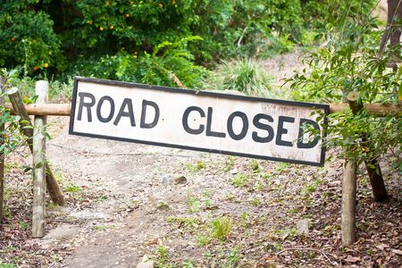 Road ahead closed sign and barrier fence crossing