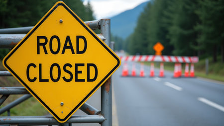 Yellow Road Closed sign on metal barrier with roadblock and detour cones