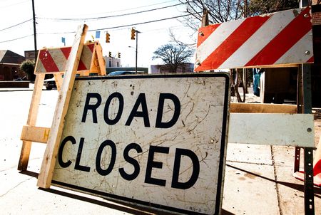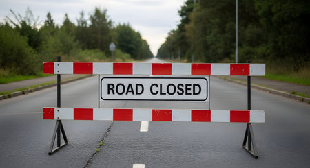 Road closed with barriers for roadworks