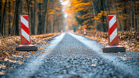 Vibrant autumn foliage frames a winding woodland path halted by orange safety barriers, evoking a sense of seasonal transition and outdoor caution.