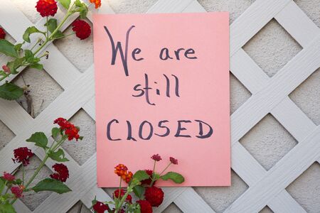We are still closed sign continues business closure with handwritten sign on orange paper on wall with trellis and flowers