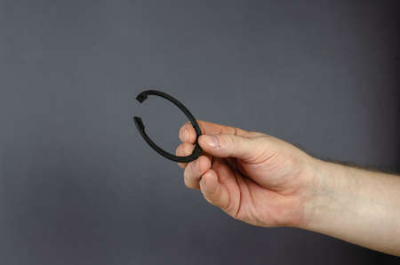 A man demonstrates Locking Ring against a gray background. New Metal round ring made of special steel for fixing the car hub bearing. Spare parts, consumables. Side view.