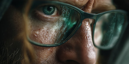 Close Up, Man With Glasses, Binary Code Reflecting In His Eye, Highlighting Digital World Concept.