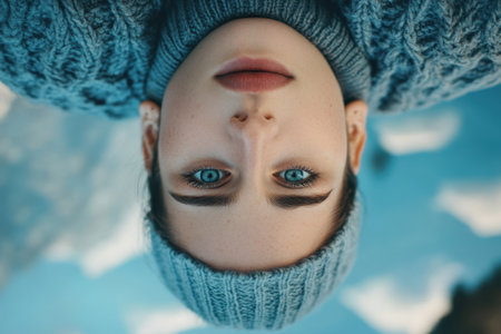 A young woman gazes directly at the viewer with striking blue eyes while surrounded by snow.