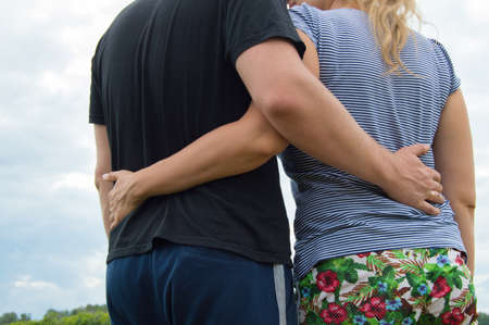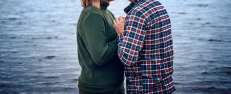 A guy and a girl hugging against the backdrop of a lake. A loving couple. Family happiness.