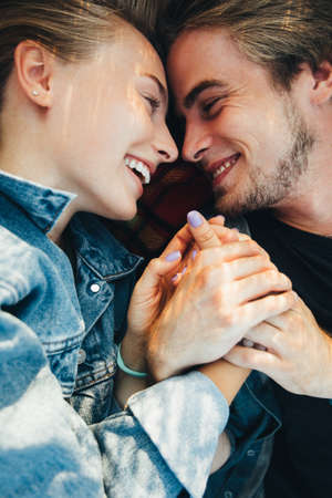 Close-up image of loving romantic couple on holiday having fun and enjoy the time. Couple in love hugging each other. Image with an tilt-shift effect