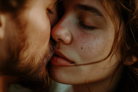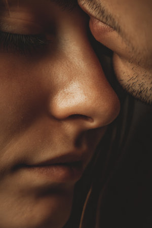 Intimate moment between a couple captured in soft lighting with a focus on their closeness and affection