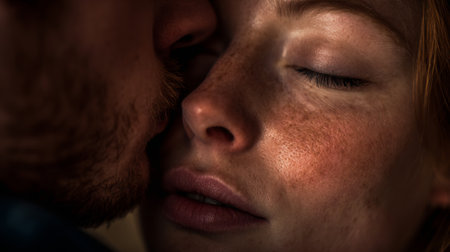 Two people sharing an intimate moment close together, highlighting connection and affection in soft lighting