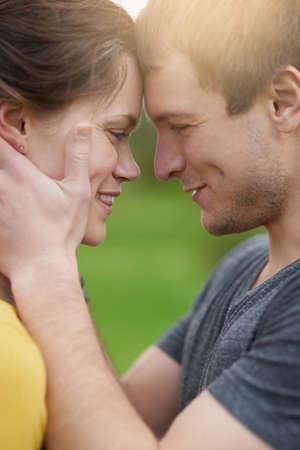 Close-up portrait of beautiful young couple kissing and embracing each other