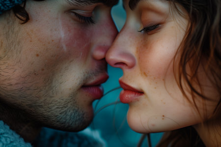 A close-up of a couple's lips barely touching in a kiss, with focus on the intimacy and the texture and tones of their skin