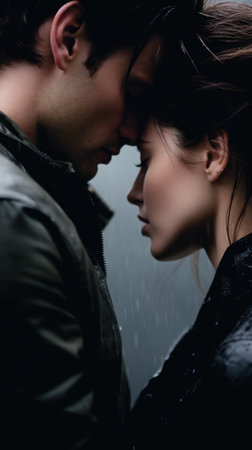 A loving couple leans in closely, their foreheads gently touching, radiating warmth and affection. This intimate scene captures the essence of romance, highlighting their deep emotional connection and the soft glow of natural light surrounding them.