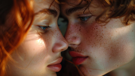 Captured in a soft, close-up, two individuals with freckled skin share a quiet moment, their foreheads gently resting together.