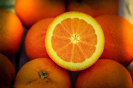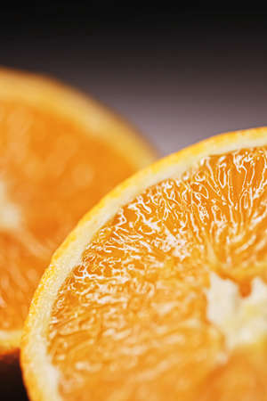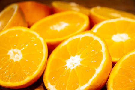 Juicy oranges half cut and sliced, healthy food and fruit closeup