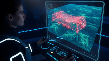 A woman in a futuristic suit uses a control panel with joysticks and buttons, viewing a 3D...