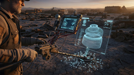Fiction showing man with metal detector and holographic 3d model of an in a desolate junkyard...