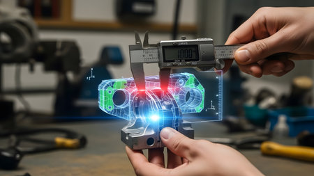 Engineer uses digital caliper to measure a metal part with a holographic blueprint overlay.