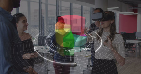 Image of statistics and financial data processing over diverse business people in office. Global business, finance and data processing concept digitally generated image.