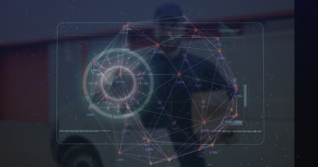 Staring creative woman showcasing digital network overlay on face by window, with gold earring. Futuristic, innovation, technology, portrait, wellness, connectivity, abstract