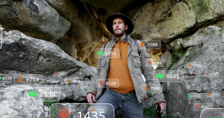 Exploring adult hiker wearing sunhat holding camera at rocky cave mouth, with data overlays. Adventure, exploration, rugged, outdoor, technology, navigation, wilderness