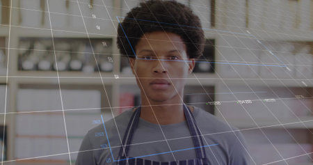 Image of data processing over african american woman exercising in gym. Global sports, science, computing, digital interface and data processing concept digitally generated image.