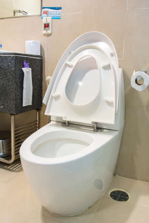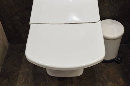 soft focus flush toilet and silver bin in white bright toilet room - clean toilet room stomach health background concept