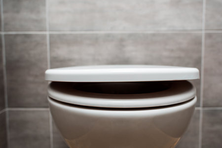 Toilet close up, water flushing in toilet, A photo of a white ceramic toilet bowl. White hanging toilet seat in home bathroom with gray tiles