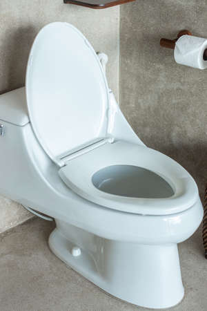 New ceramic toilet bowl and toilet paper. Cleaning, WC, Lifestyle and personal hygiene concept