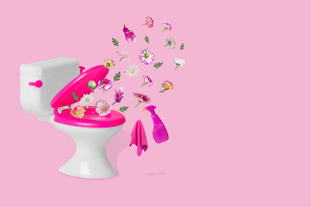 Creative idea with a toilet bowl, bottle with a spray and various flowers flying in the air on a light pink background.Minimal concept of hygiene, protection, cleaning, disinfection, refreshment and tidy toilet.