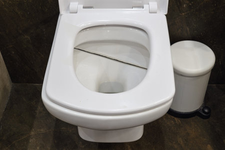 Cracked toilet bowl in the home bathroom. A broken bowl in the home toilet
