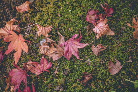 falling maple, texture of dried maple leaves falling on moss yard, Japan
