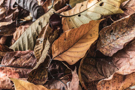 Dry autumn leaves falling down and pile up on floor, there are can made fertilizer for agriculture husbandry or farming, natural background