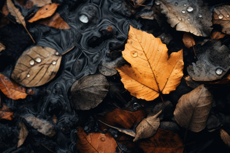 Dark black and golden leaves with dew drops in moody natural ambiance background.