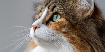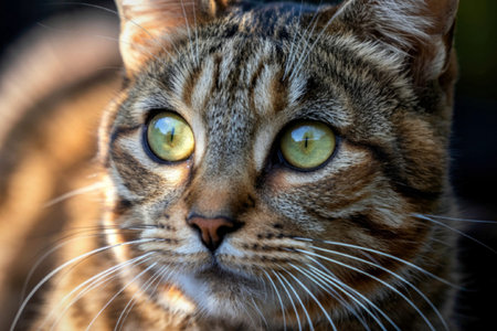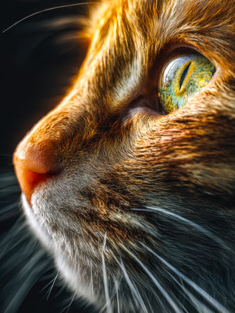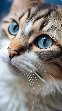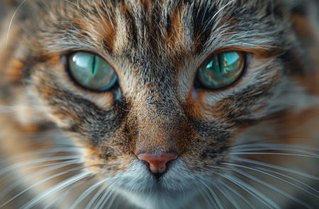 A perfect moment of feline beauty in vivid detail. This detailed shot captures the cats face with its striking whiskers and glossy fur. The multicolored coat gleams under the light.
