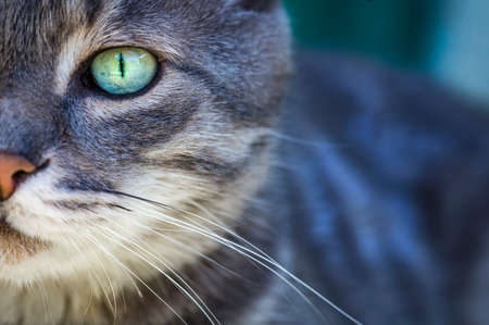 Portrait of a gray tabby cat with green eyes and pink nose. Focus on the beautiful green cat's eye. Only half the face of the cat visible.