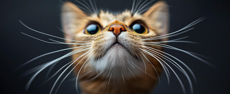 A curious cat gazing upward with striking eyes and prominent whiskers against a dark background