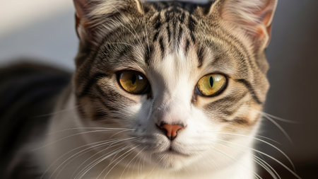 A domestic cat with grey and white fur is centered, bathed in natural light. The close-up showcases vibrant yellow eyes. A minimalist setting with subtle shadows and a small decorative object suggests an interior space. Suitable for various editorial and commercial applications.
